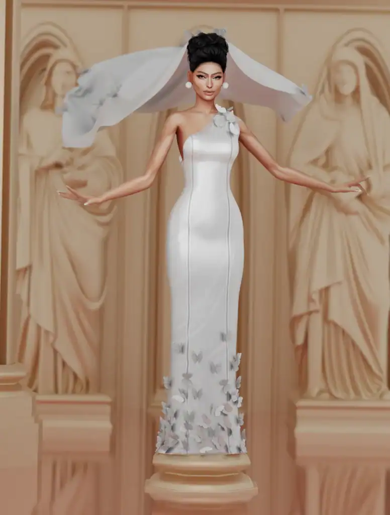 Why be basic when the Glitter Veil adds pure drama and sparkle to your Sim’s bridal look? The veil features a shimmering, light-catching texture that creates a magical, almost fairytale effect as it trails behind the gown. The veil comes in 10 swatches, including classic whites, beige, and red. This Sims 4 wedding cc pairs best with simple or structured wedding dresses to let the sparkle stand out.