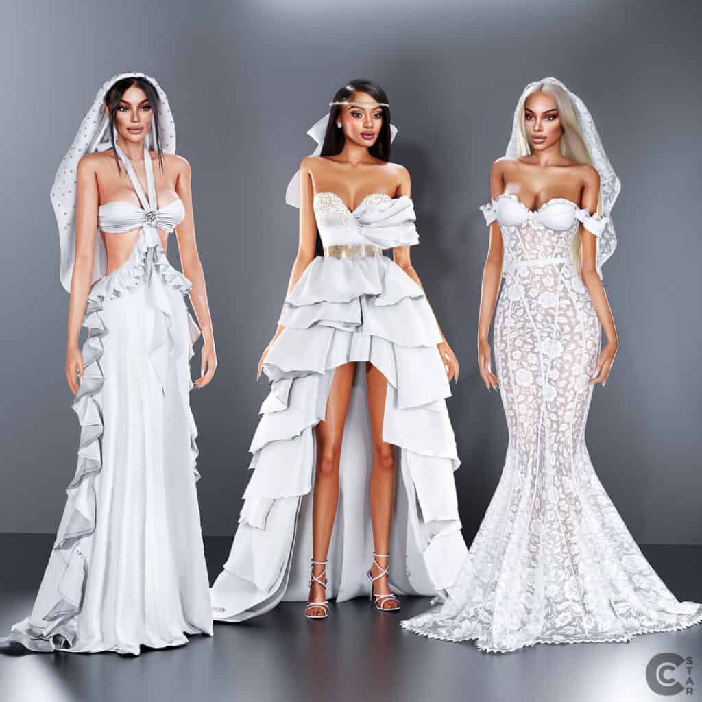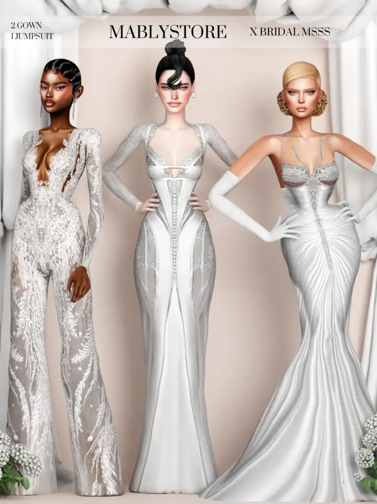 The Dream Wedding CC Collection delivers a high-fashion bridal lineup designed to create bold, cinematic wedding looks in-game. This stunning collection includes multiple statement gowns, such as: