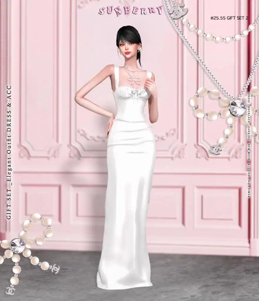 The set also includes matching accessories: a statement bow necklace and coordinating earrings. They’re designed with pearl-like details and metallic accents. Click on the attached link for more information on this Sims 4 wedding cc.