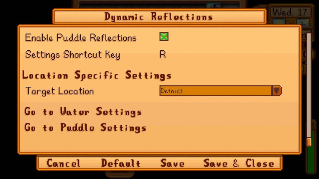Dynamic Reflections is a stunning visual enhancement that adds realistic water reflections across Stardew Valley. The mod introduces subtle mirrored reflections of nearby environments, like rivers, lakes, and ponds, for a more immersive and polished look throughout the valley.