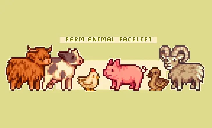 Farm Animal Facelift is a popular visual overhaul designed to make your livestock look cuter and more aesthetic. The mod refreshes Stardew Valley’s barn and coop animals with cleaner, more detailed sprites. It reworks animals like cows, goats, sheep, pigs, and chickens so they look softer, rounder, and more expressive.