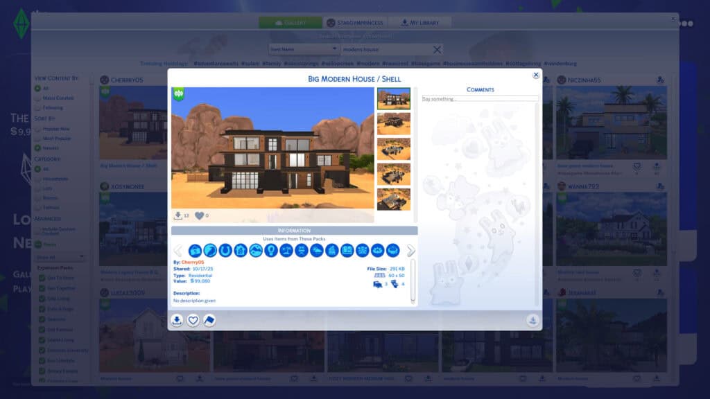 Now that you’ve prepared your game folders and updated everything, it’s time to actually find and download your dream home. There are two main ways to add new houses to The Sims 4 account – through the in-game Gallery or from external sites, like The Sims Resource, where creators share their Tray files and custom builds.