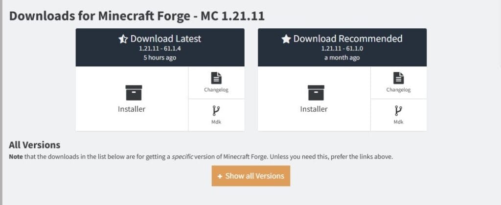 Visit the official Forge website and download the installer that matches the same version of Minecraft you’re using. For instance, if you’re using Minecraft 1.21.11 (the latest version), download the Forge version compatible with it.
