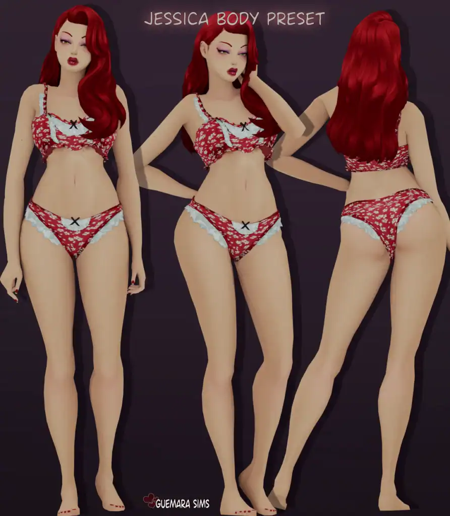 If you’re looking for a curvy, glam-inspired body preset, the Jessica Body Preset has got your back. This dramatic hourglass shape features a cinched waist, fuller hips, and a more pronounced bust than the EA body preset. Inspired by classic bombshell proportions, this preset enhances curves while still letting you fine-tune the body with CAS sliders.
