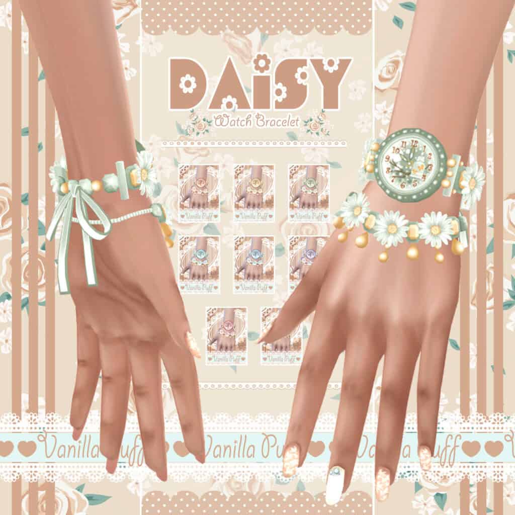 If you want something playful and detailed, check out the Vanilla Puff Daisy Watch Bracelet. This accessory is a functional watch combined with floral bracelet elements for a full wrist look. You’ll get daisy accents, bead details, and a cute watch face all combined, along with 8 swatches to switch between soft color palettes.