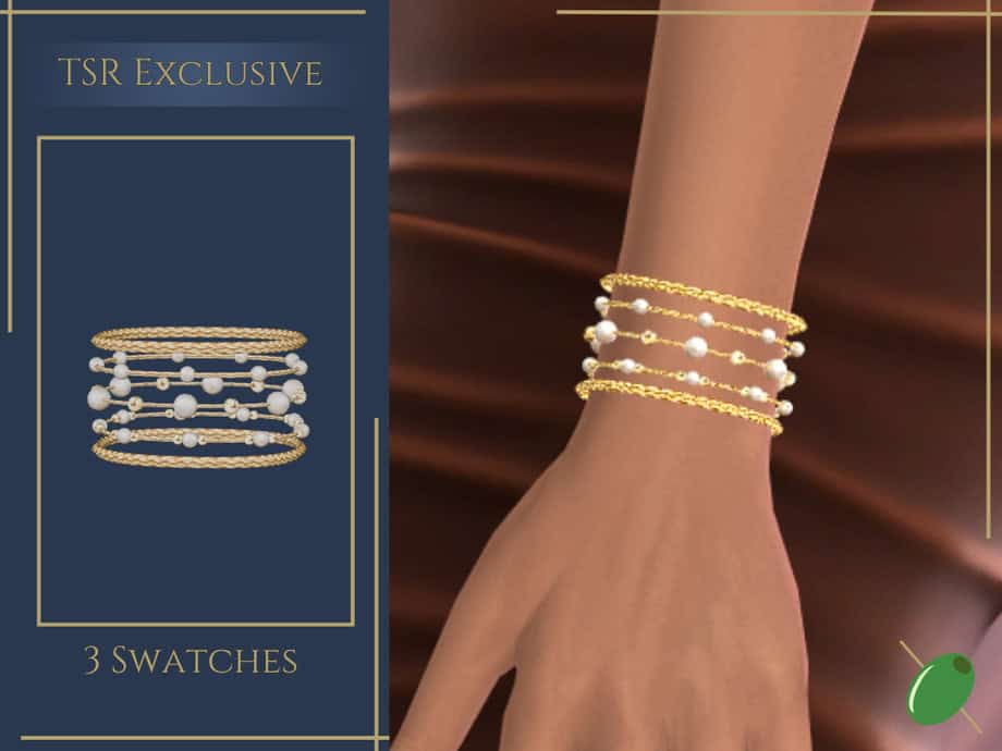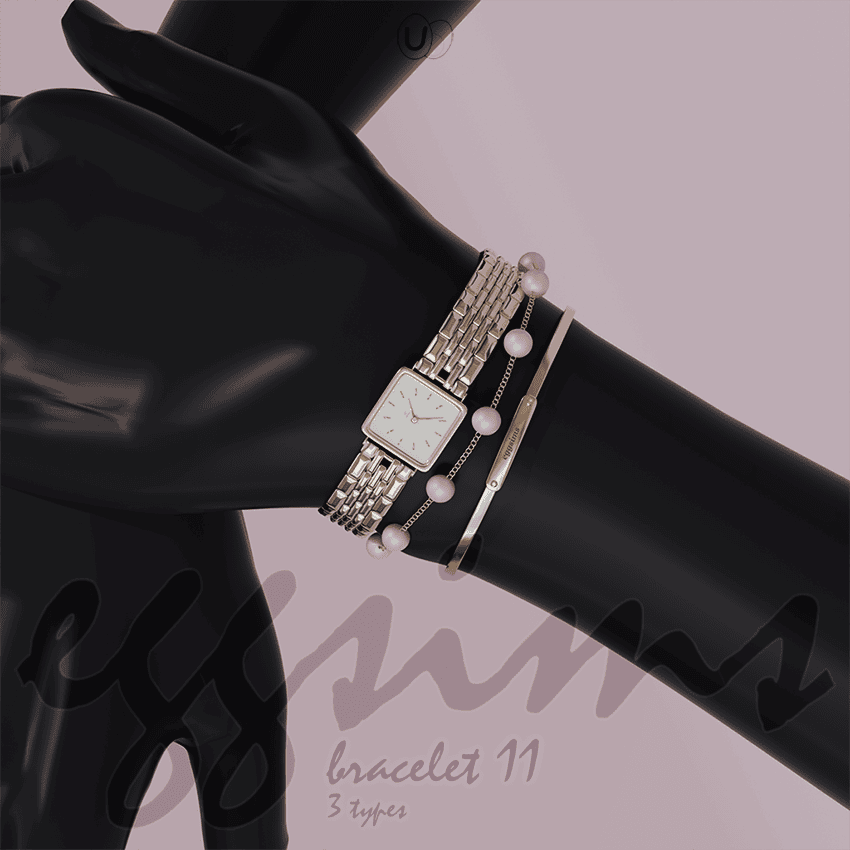 Bracelet 11 combines a square-faced watch with two bracelets – a chain band with pearl accents and a slim bangle for a stacked look. You’ll get 3 versions of this Sims 4 bracelet cc merged into one package. It comes with 3 swatches, so you can switch between slightly different styles without cluttering CAS.