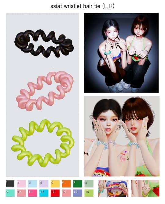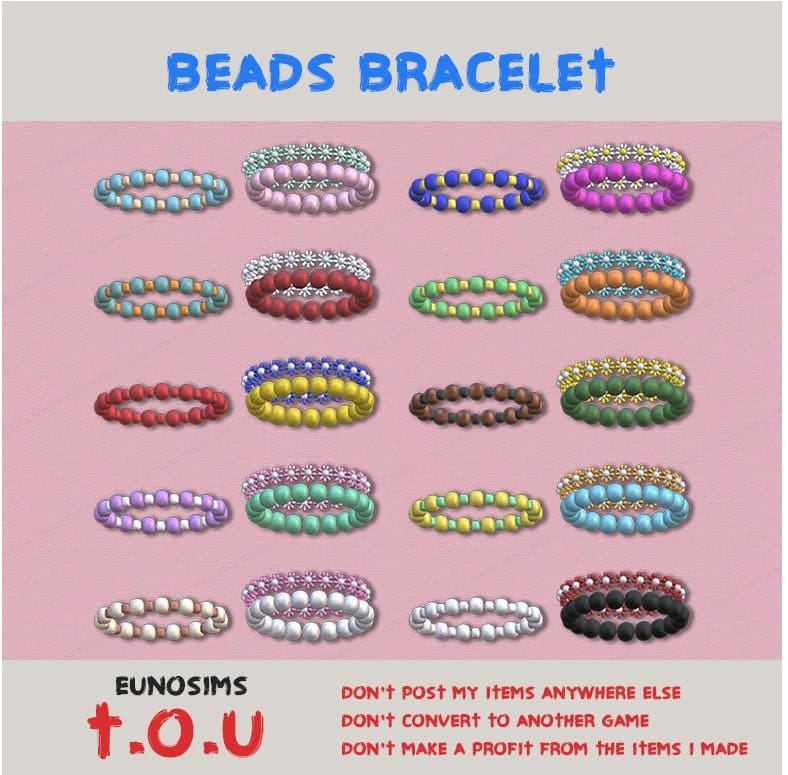 The bracelet comes in multiple swatches, giving you plenty of color combinations to work with, from soft pastels to bold, vibrant mixes. To find it, head over to the wrist category in CAS. I’d pair this Sims 4 bracelet cc with casual outfits, summer looks, or playful aesthetics.