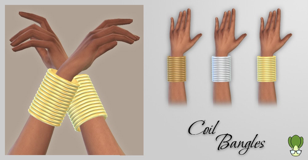 Coil Bangles are stacked spiral cuffs wrapping around your Sim’s wrist for a bold, statement look. You’ll find them in three metallic swatches, making it easy to switch between tones.