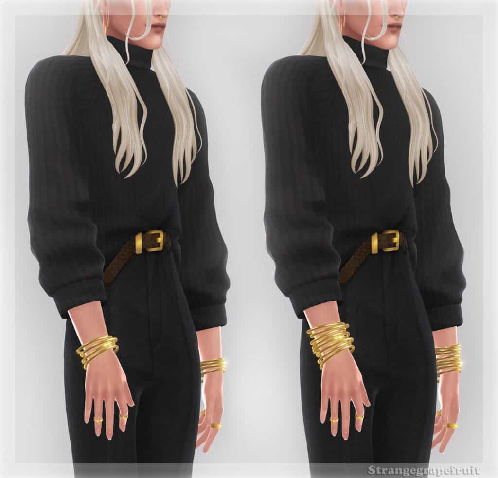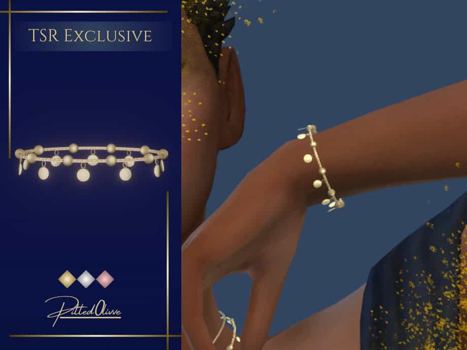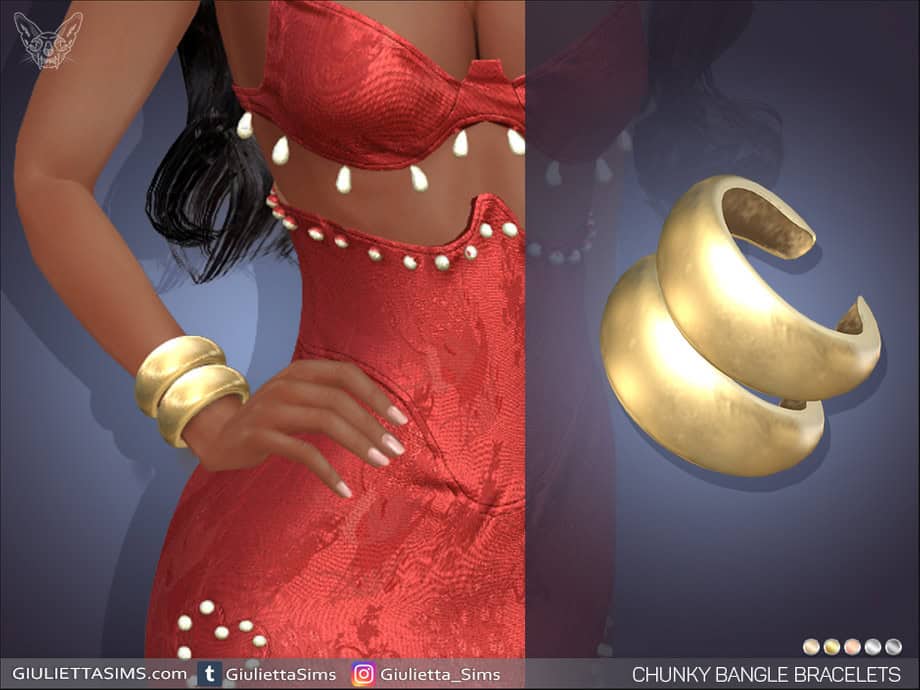 Chunky Bangle Bracelets are thick, curved cuffs with a smooth metallic finish to stand out on your Sim’s wrist. The Sims 4 bracelet cc comes in 4 swatches, including yellow gold, white gold, rose gold, and black-plated options.