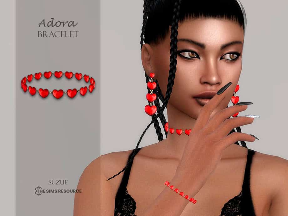 Adora Bracelet is a playful, heart-lined piece designed to bring a bold, flirty touch to your Sim’s look. The small, evenly spaced heart charms wrap beautifully around the wrist for a cute yet eye-catching finish.