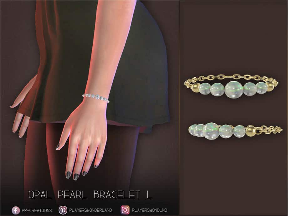 If you want a soft, luminous accessory to elevate your Sim’s look, Opal Pearl Bracelet L is a perfect pick. This bracelet has a delicate chain lined with glowing opal-like pearls, and the dreamy, slightly iridescent finish translates beautifully in CAS.