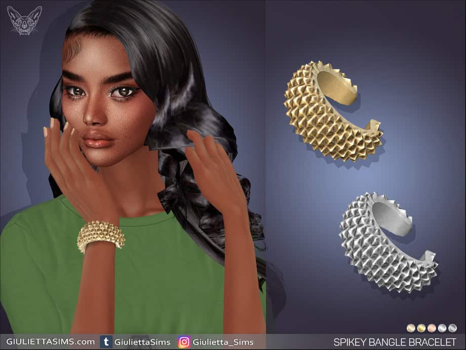 Spikey Bangle Bracelet is a thick cuff covered in raised spike-like detailing for a bold, textured look. Available in 4 metallic swatches, including gold, silver, rose gold, and black-plated options, this Sims 4 bracelet cc is a standout option in CAS.