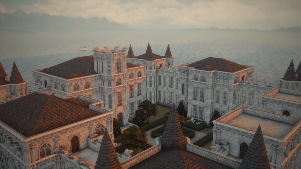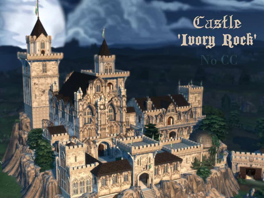 Castle “Ivory Rock” is a large medieval-style fortress designed with layered walls, multiple towers, and a dramatic elevated layout. The exterior stands out with detailed stonework, archways, and connecting sections. This gorgeous castle has a more rugged and realistic castle feel compared to other Sims 4 castles on this list. It’s the perfect dramatic backdrop for screenshots.