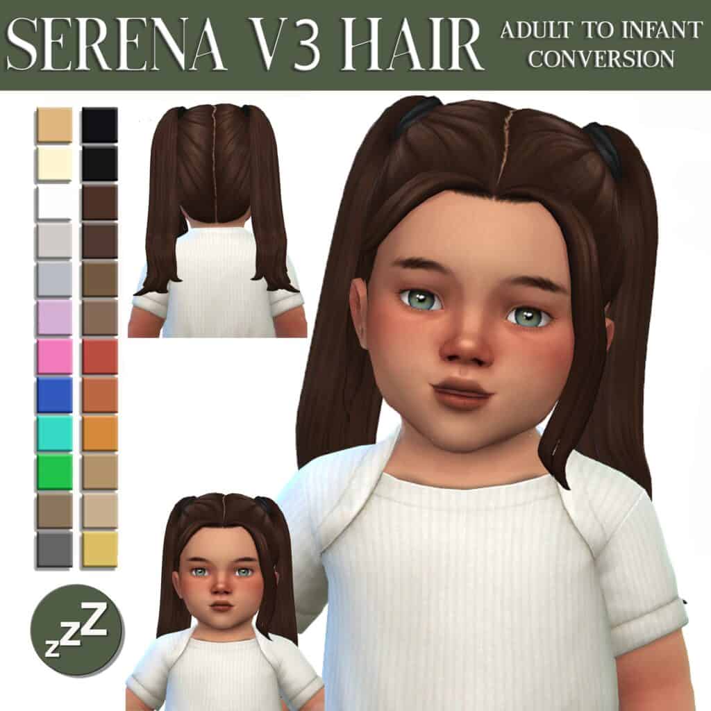 Serena V3 Hair Conversion is a neatly parted hair styled into soft pigtails. The hair comes in all 24 EA swatches, including white, brown, black, green, and blue. This gorgeous hair is compatible with hats, meaning you can complete your Sim’s outfit with a stylish cap.