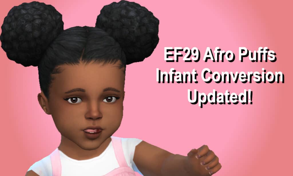 Afro Puffs Infant Conversion Updated is a cute hairstyle designed specifically for infant Sims. It comes with two textured afro puffs tied on each side of the head. The style is playful and age-appropriate.
