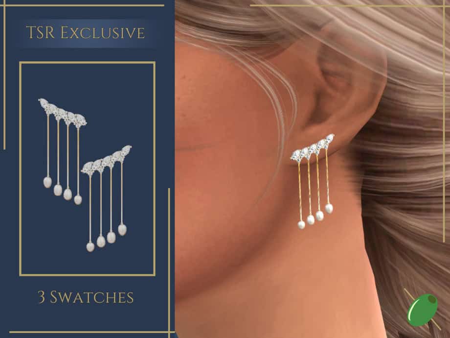 The earrings come in 3 swatches, allowing you to choose the variation that best matches your Sim’s jewelry collection. They work especially well with formal dresses, evening outfits, or bridal styling.
