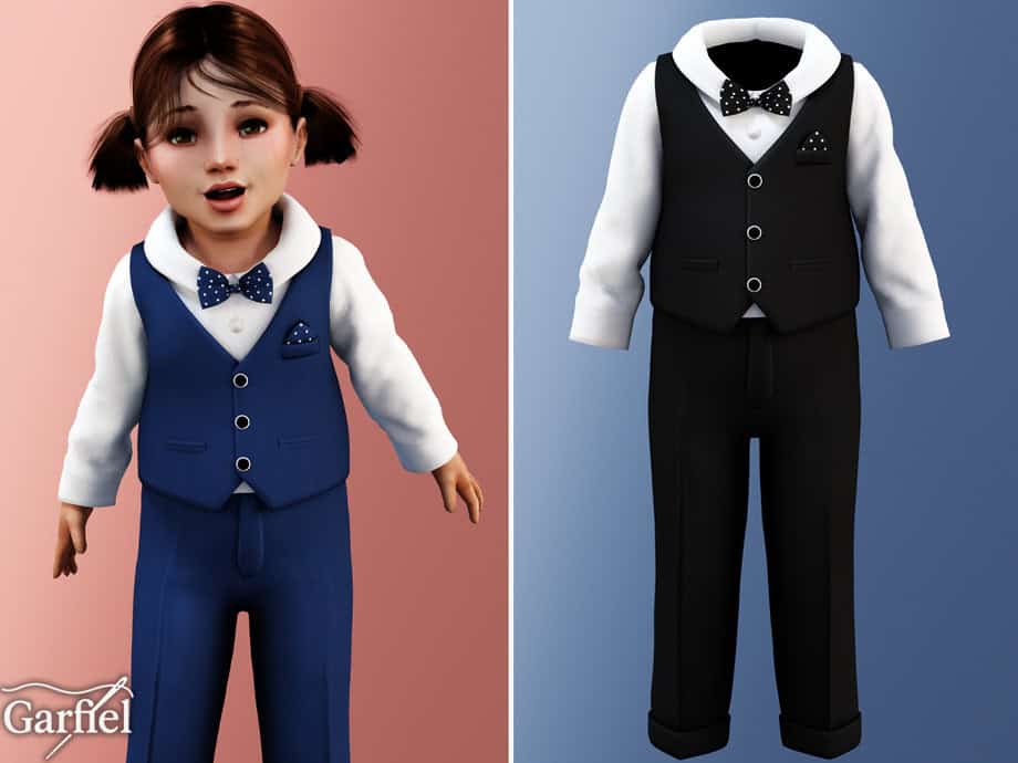Dressy Vest Suit with Bow Tie and Shirt is a polished toddler formal outfit that combines a crisp long-sleeve shirt with a tailored vest and matching trousers. The outfit is perfect for weddings or family photos, and it’s one of my favorite Sims 4 cc finds for March 2026.