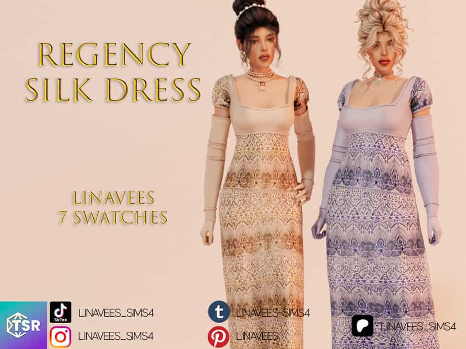 Regency Silk Dress is an elegant full-length gown inspired by classic Regency fashion. The soft empire waist, delicate short sleeves, and long gloves add a refined, vintage touch to your Sim’s look.