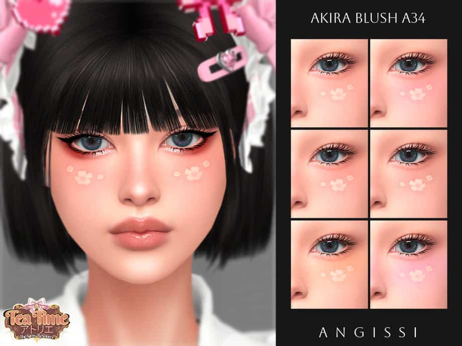 Akira Blush is a soft, decorative blush you can use to add a delicate touch of color to your Sim’s face. It has small heart-shaped accents under the eyes, giving your Sim a cute, playful aesthetic. The blush creates a subtle kawaii-inspired makeup look.