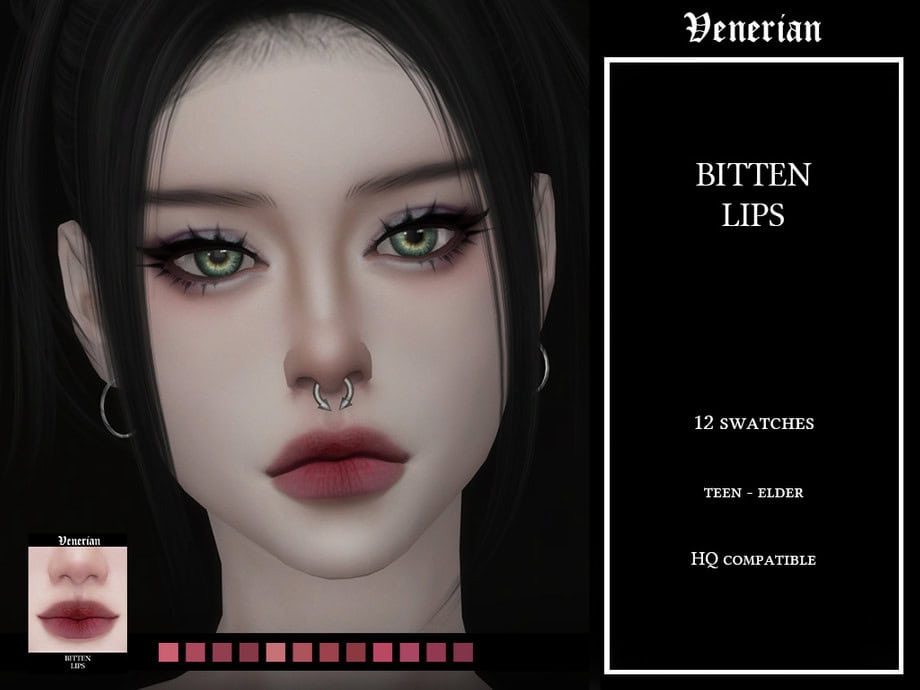 It comes in 12 swatches and is available for Sims from teen to elder. You’ll find it in the Makeup > Lipstick category, and it has no gender or frame restrictions. It’s also fully HQ compatible for high-quality screenshots and close-up CAS views.