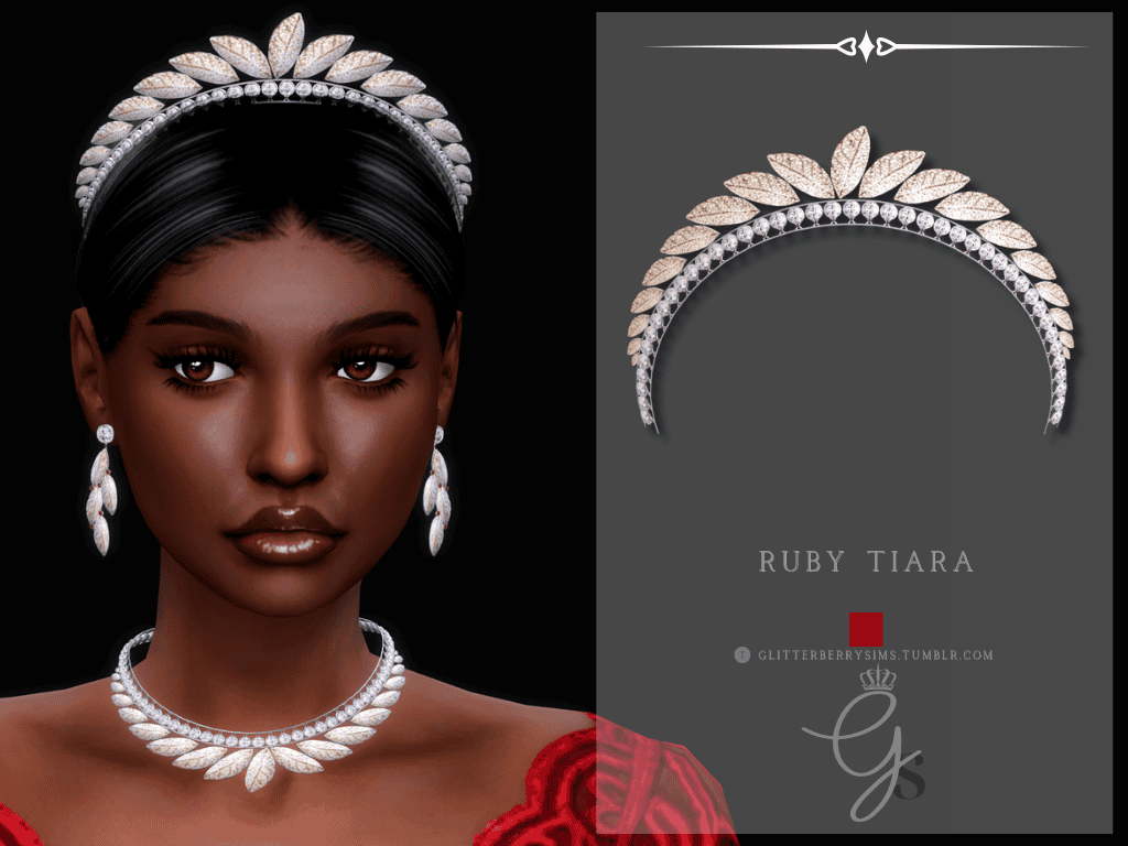 The Ruby Tiara Set is a Sims 4 crown cc pack with a striking ruby tiara designed with layered red gemstones, diamond accents, and gold leaf detailing. The tiara comes in two variations, including a more detailed statement version and a smaller gold leaf design, giving you flexibility depending on how dramatic you want the final look to be.