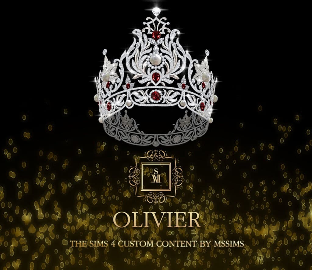 Olivier Crown is a bold, pageant-style piece with a tall, intricate design and sparkling gemstone details. The beautiful piece is perfect for beauty queens, formal events, or Sims who love standing out in a room.