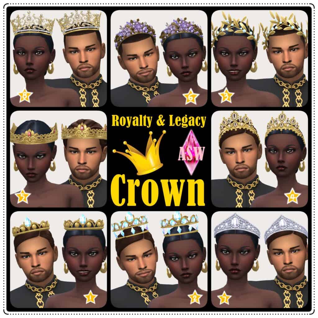 Royalty & Legacy Crown is a full set of 8 crowns, each designed for a different royal style. You’ll get a mix of classic gold crowns, gemstone-heavy pieces, and more detailed tiaras for male and female Sims. The designs lean into that regal, legacy-style aesthetic, so they fit perfectly in monarchy gameplay, storytelling saves, or even high-fashion CAS looks.
