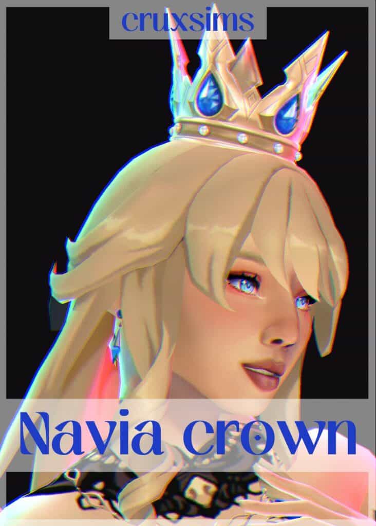 King Navia Crown is a bold, fantasy-inspired piece with sharp, sculpted points and large gemstone accents. This crown was converted with a specific hairstyle in mind, so use it to avoid clipping. It comes in a single blue-and-gold swatch.