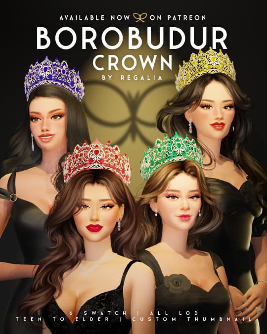 If you want your Sim to look instantly royal, download the Borobudur Crown. It features intricate filigree detailing and gemstone accents that really stand out, especially when styling pageant looks, royal storylines, or elegant formal outfits.