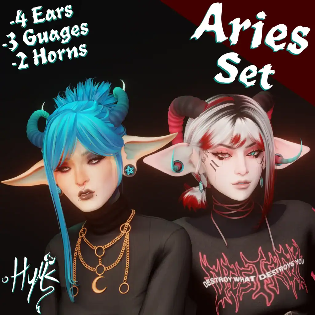 Aries Set is a collection of fantasy ears, gauges, and horns designed for occult or alternative-style Sims. This set includes four ear meshes, three ear gauges, and two horn options, allowing you to create demon, punk, or supernatural characters.