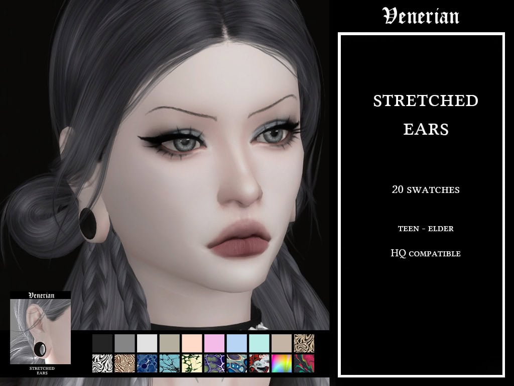 Stretched Ears 1 by Venerian is a pack with stretched ear lobes designed for Sims with gauge piercings. In CAS, the shape creates a wide tunnel opening that pairs well with plug or tunnel-style earrings.