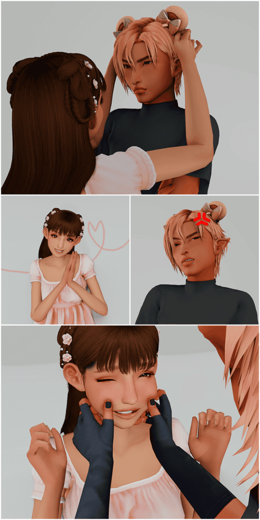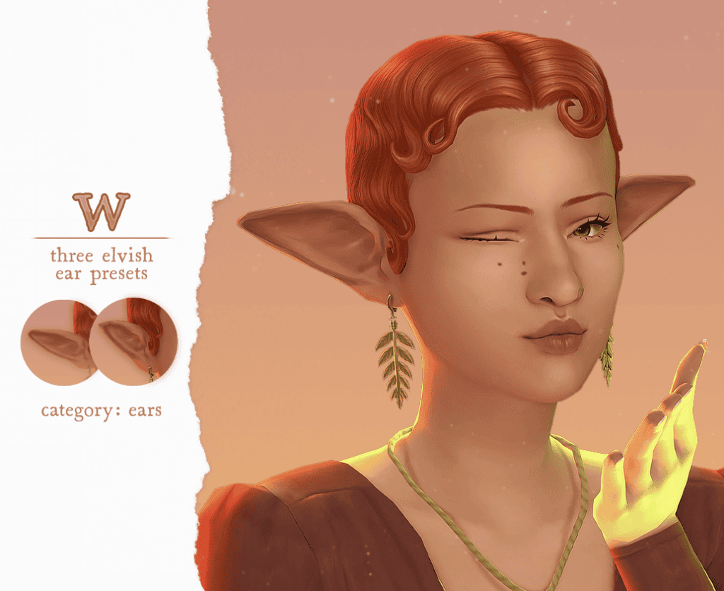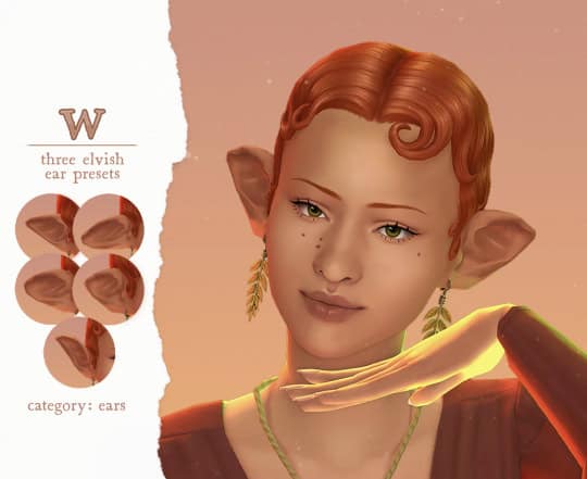 These ears appear in the accessories category (nose ring slot), while the included presets hide the default EA ears and can be found in the ear form category in CAS. The set is compatible with the base game and looks stunning in CAS.