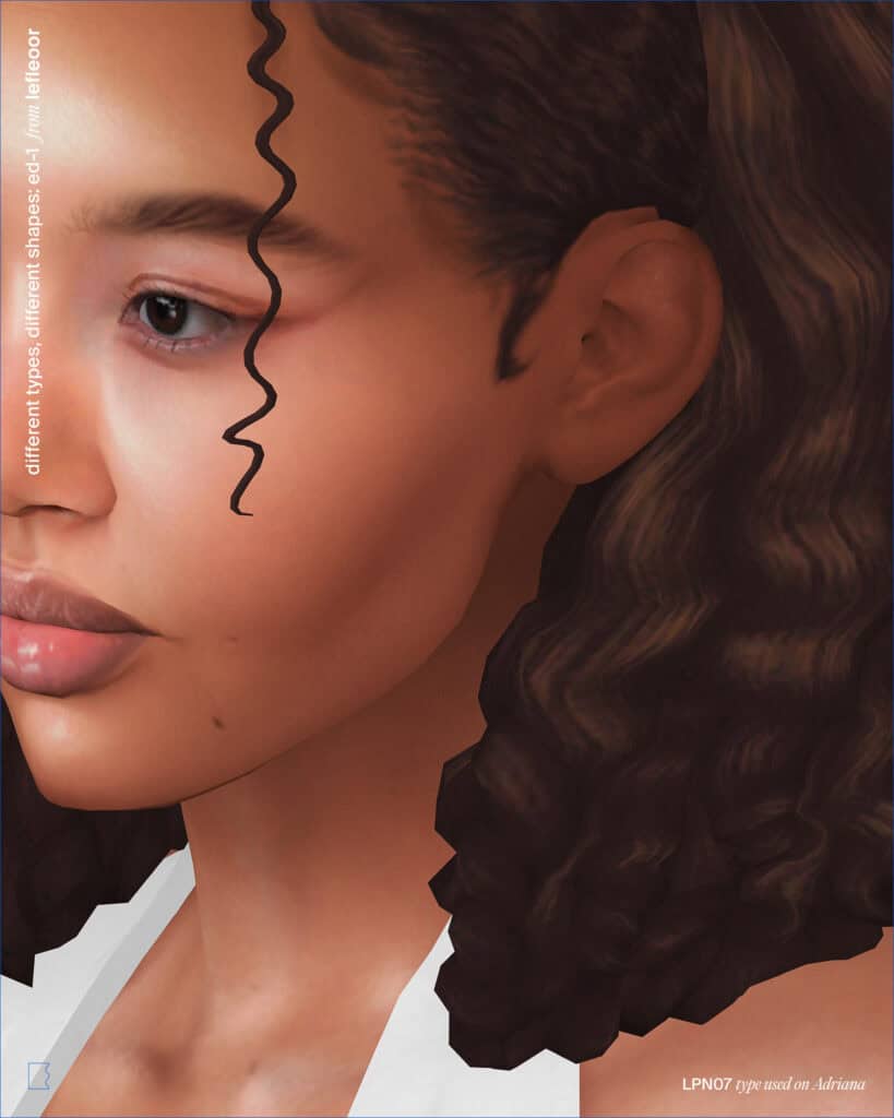 Ear Presets 01–03 features three ear presets that change your Sim’s overall ear shape. The presets create subtle variations in ear curve, helix shape, and lobe structure, giving you more options when refining a Sim’s side profile.