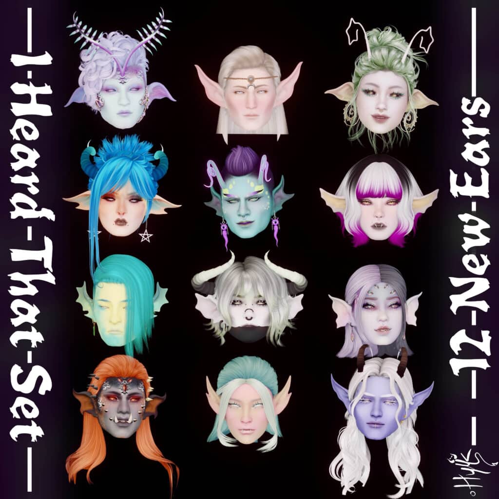 I Heard That Set is one of the largest Sims 4 ear presets, and it contains a wide range of shapes, from long elven ears to curved demon-style ears and aquatic-inspired fins. This gives you more variety when creating supernatural characters.