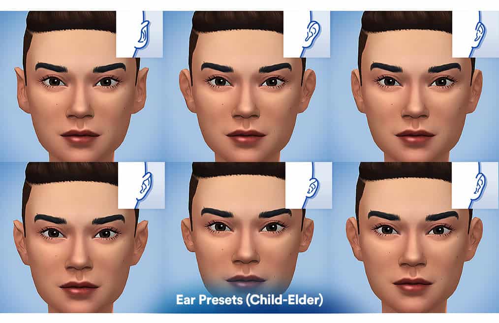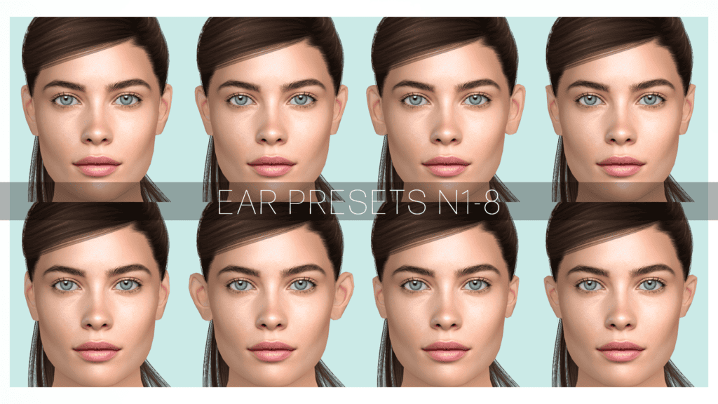 Ear Presets Collection features eight non-default ear presets for creating human, natural Sims. Each preset slightly changes the ear curve, size, and angle, making it easier to create distinct facial profiles.