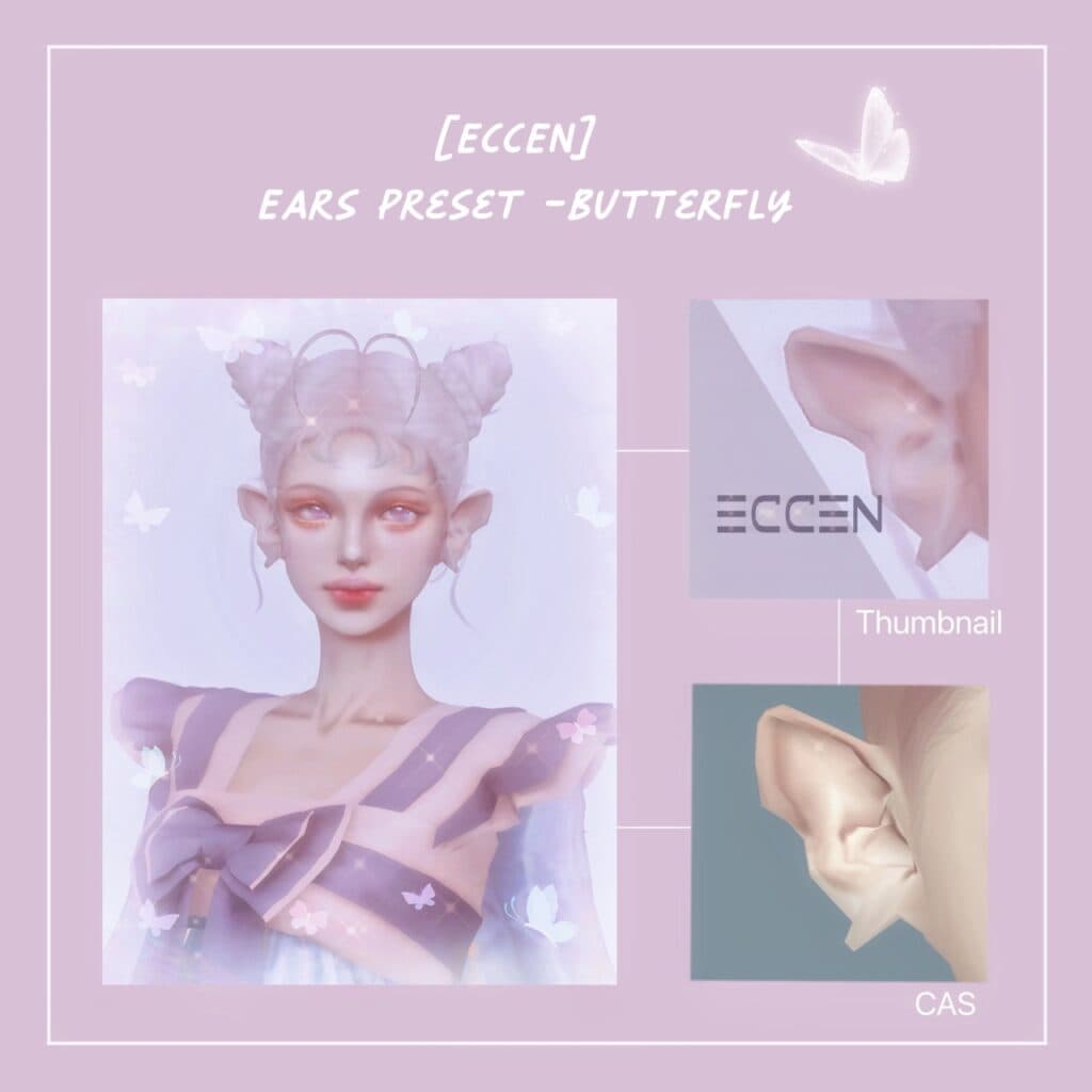 Butterfly Ears Preset features a soft upward curve with a slightly folded inner ridge. These light, whimsical Sims 4 ear presets suit magical or supernatural characters.