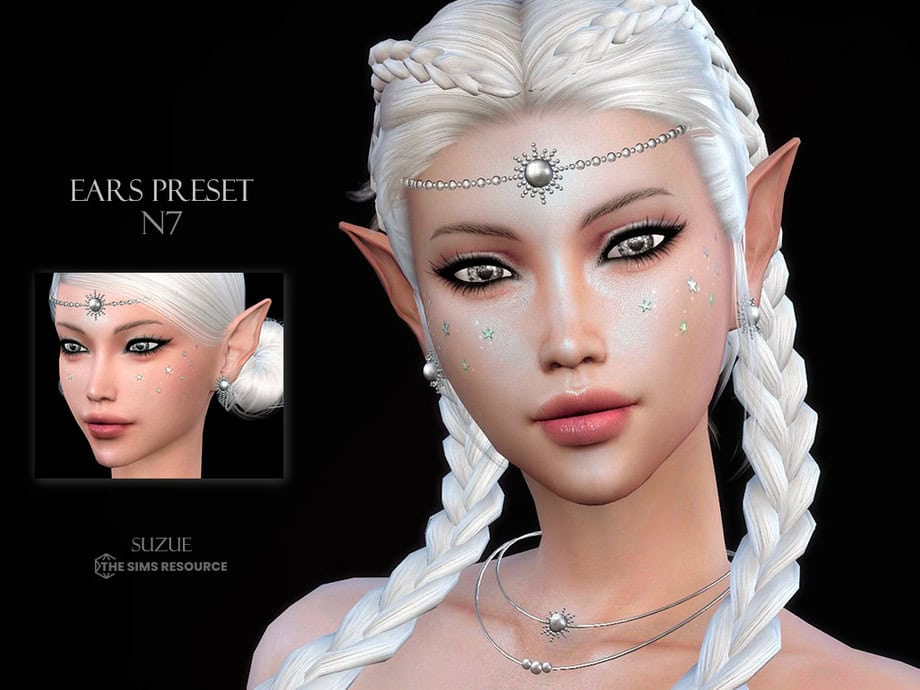 If you’re looking for a sharp, fantasy-style ear shape, use the Ear Preset N7 by Suzue to replace your Sim’s base game ears. This preset features long, pointed ears that taper outward, which is ideal for creating elves, fae, or other occult-inspired Sims.