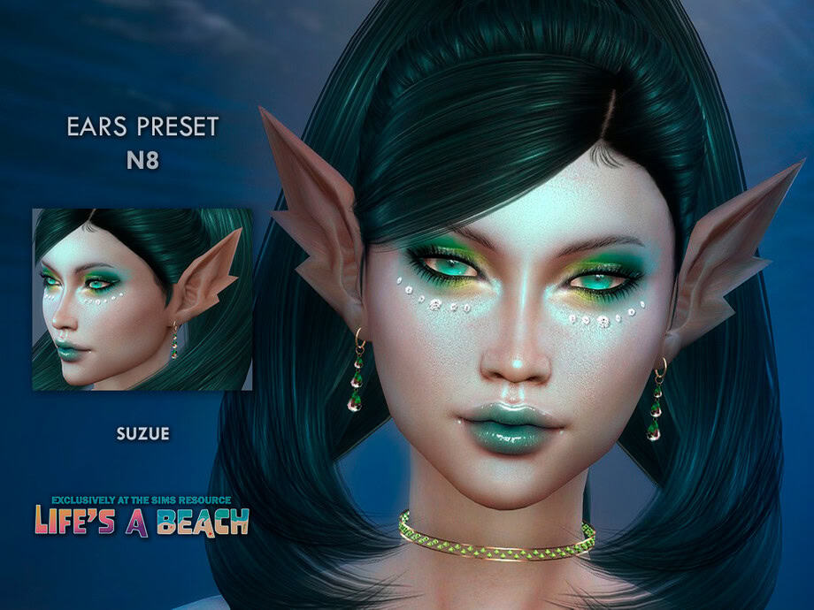 Life’s a Beach Ear Preset N8 is a sharp, fantasy-style ear preset with long, pointed tips to give your Sim a distinctive elven profile. I love how the shape is more dramatic than standard EA ears, making it a great choice for occult or fantasy characters.
