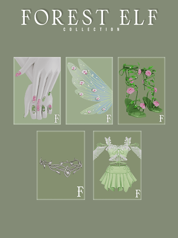 Forest Elf Collection is a nature-themed fantasy set containing multiple pieces for your female elves. You’ll find a short leaf-style dress paired with floral heels and decorative wings, all designed to give your Sim a light, magical look.