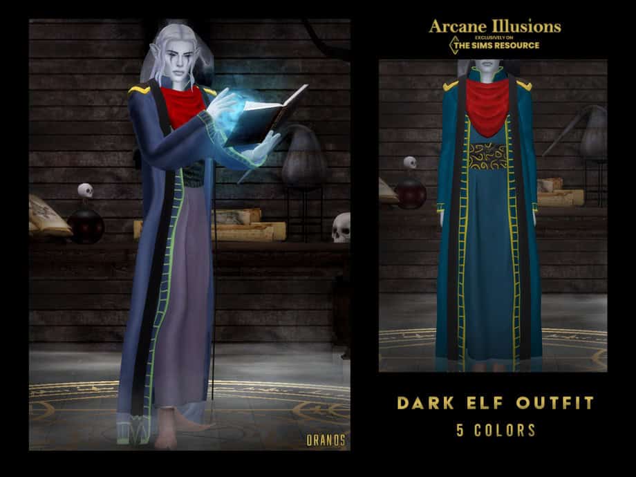 I recommend using this to create mage, sorcerer, and dark elf characters. The outfit comes in 5 colors. I used this outfit in-game and it has a few texture issues along the robe, but it still looks great.