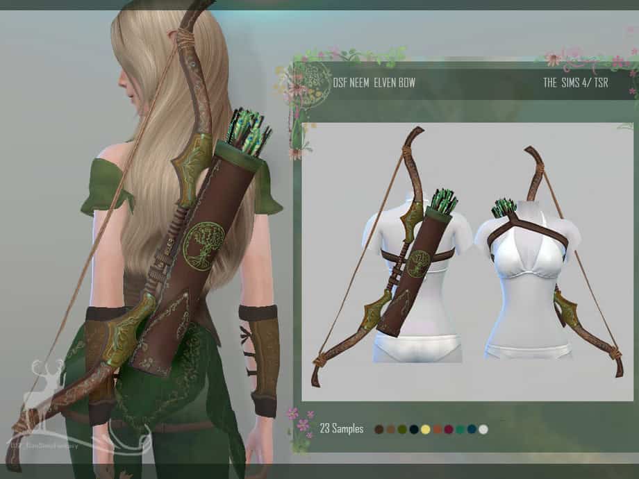 Neem Elven Bow is a detailed fantasy accessory designed to give your elf Sims a ranger or archer look. The accessory features a curved wooden bow paired with a quiver filled with arrows, all attached to a strap that sits across the back.