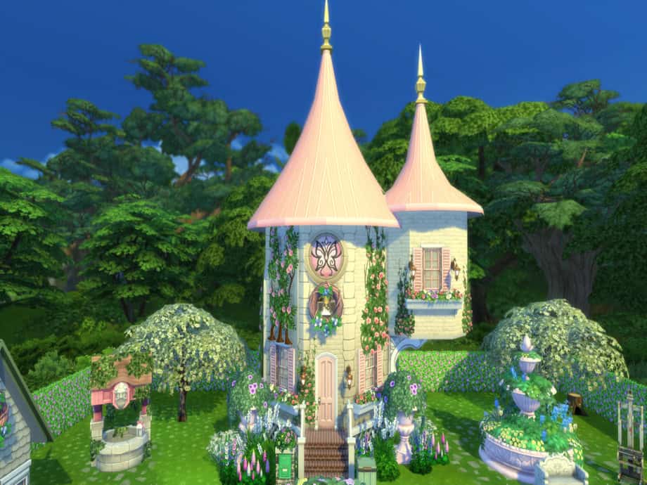 Cute Pink Cottage is a small fantasy-style home designed for woodland elf or fairy Sims. The build features a tall storybook tower with two pointed pink roofs and vine-covered walls.