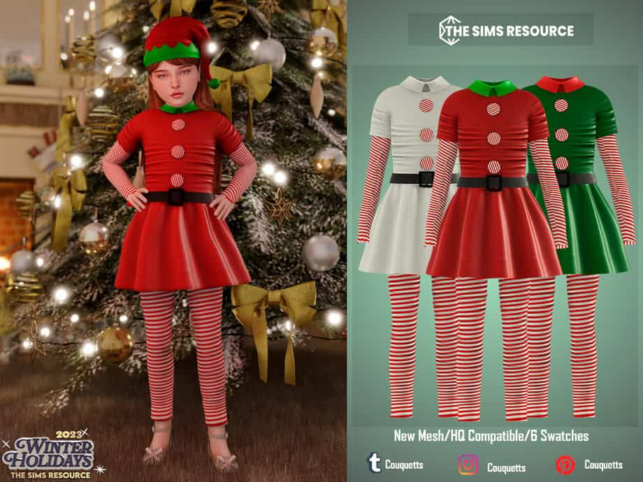 If you’re looking for a festive elf outfit for child Sims, check out the Elf Holiday Dress. This playful holiday-themed dress comes with striped tights and classic Christmas colors. The short dress has large decorative buttons, a small belt at the waist, and long striped sleeves to match the tights.