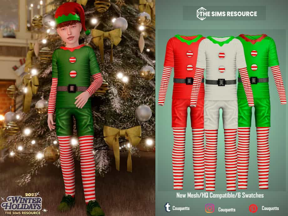 Christmas Elf Costume is a festive outfit designed for child Sims. The classic holiday elf look features a fitted tunic, striped sleeves, leggings, and a small belt at the waist.