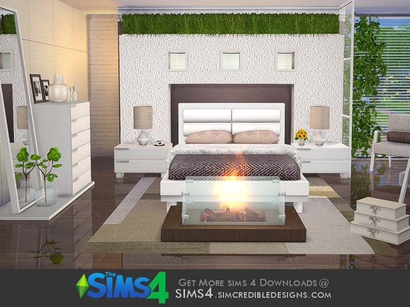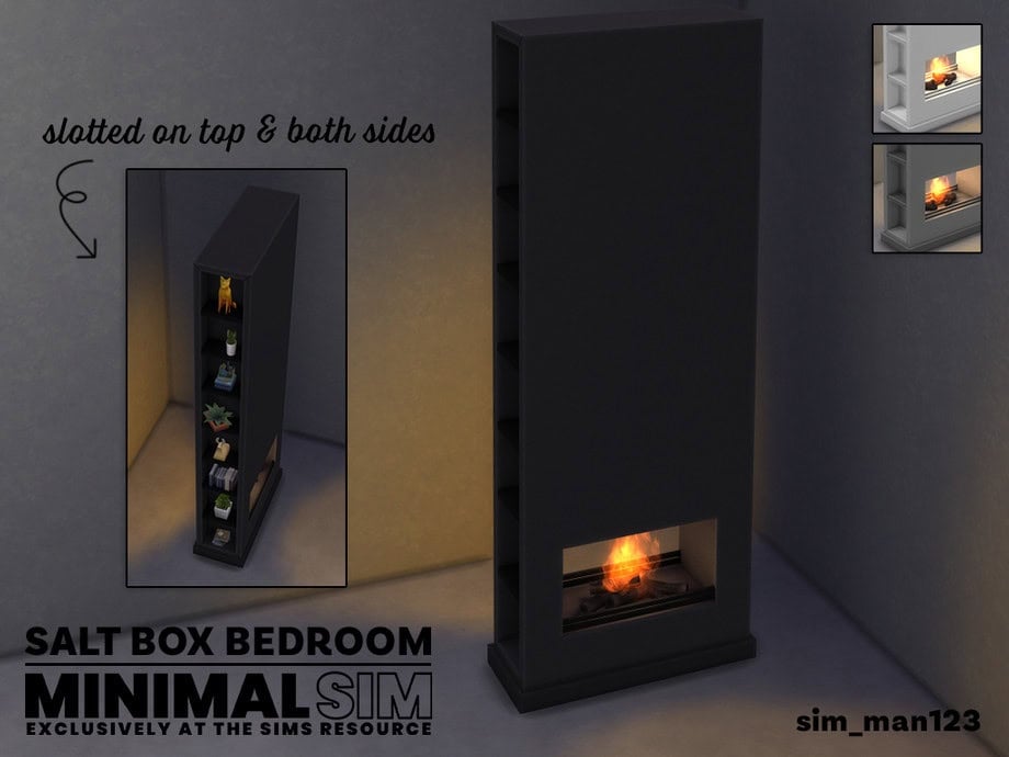 This is one of those Sims 4 fireplace CCs you can’t resist. It’s part of the Gloss set, which includes 18 matching items like beds, rugs, lamps, and shelving.