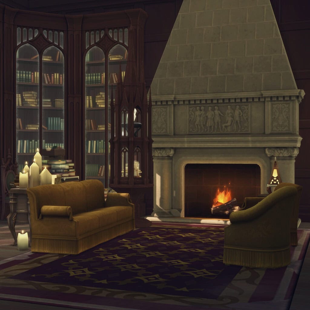 This fireplace is available in three colors and is compatible with the base game. I’d place it in a vampire parlour, a Victorian reading room, or a moody gothic bedroom.