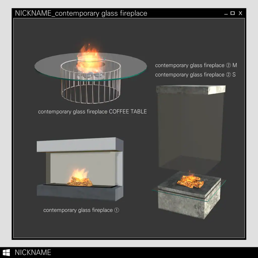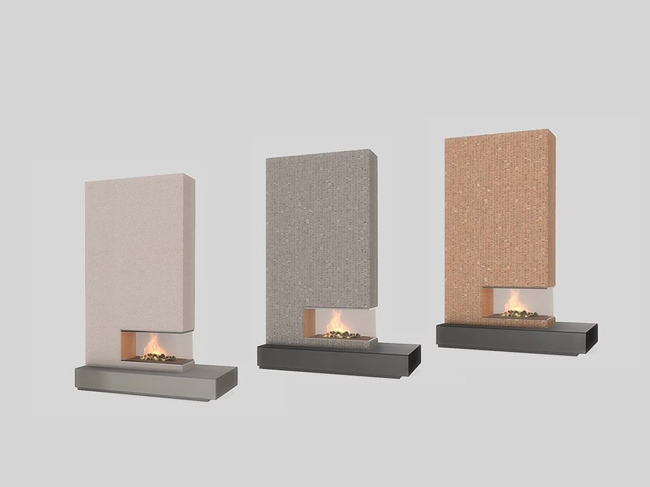 If you want ultra-modern fireplaces to use both indoors and outdoors, this Nickname collection is perfect. It contains multiple standalone fireplaces in different shapes and materials, including glass-boxed flames, a concrete pillar version, a mounted stove-style design, and a long linear burner.