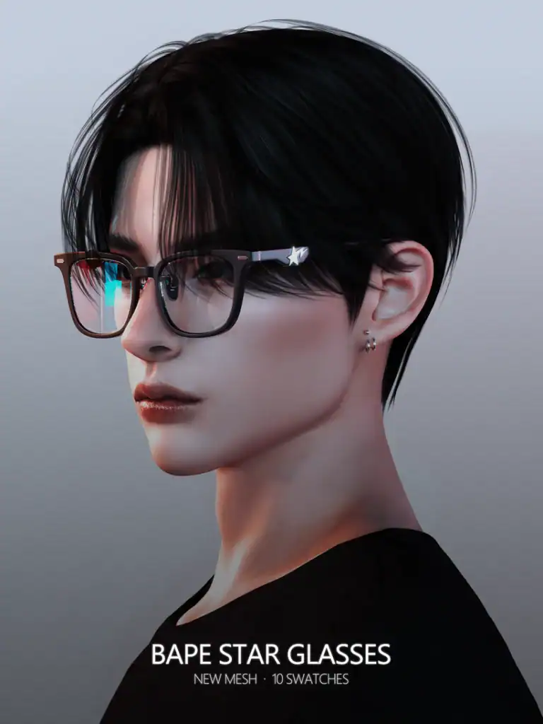 The Bape Star Glasses feature a sleek rectangular frame with subtle star detailing on the temples. This gives them a modern, streetwear-inspired look for fashion-forward Sims. The glasses come in multiple neutral and dark swatches, including black, brown, and tinted variations.
