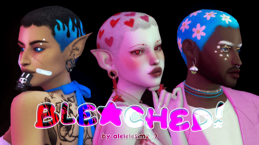 The Bleached pack by alelelesimz contains bold, graphic shaved hair designs that instantly give your Sim a rebellious goth and alternative edge. This hair set comes with 19 swatches, featuring a mix of dark bases and high-contrast designs that include flames, hearts, and floral motifs.