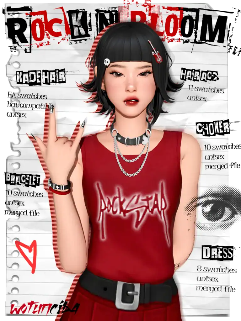 This set also includes multiple accessories like a gorgeous dress, hair clips, chokers, and bracelets. With 8 dress swatches and accessories available in 10–32 swatches, you can use this set to build expressive goth, punk, or alt-rock Sims.